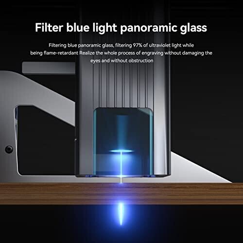 The machine features an all-aluminum alloy anodized structure designed for durability and engraving accuracy. It is a portable, predominantly pre-assembled unit that can be installed in approximately five minutes. The laser system uses a four-fold lens group collimation and focus technology with an optical power of 4.5–5 W, achieving a focus area of 0.02 mm². It can cut 10 mm thick wood and 6–8 mm black acrylic and can directly engrave mirror stainless steel and ceramics. A flame-retardant panoramic filter filters about 97% of ultraviolet light, providing eye protection and enabling users to observe engraving without goggles. The design includes a knob to adjust laser height and a horizontal gyroscope that auto-stops when tilted for safety. The upgraded fixed-focus laser offers stable power and a compressed spot with significantly higher energy concentration (about 200%), maintaining a 0.02 mm² spot size for precision engraving and efficient cutting, without the need to adjust focal length.
