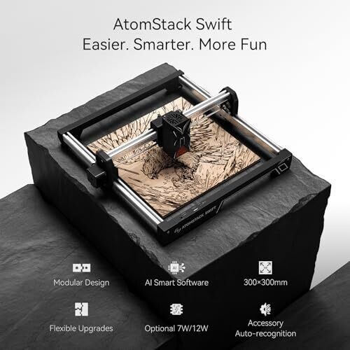 - Discover the ATOMSTACK Swift 12W Laser Engraver/Cutter, a high-performance system designed for wood, metal, dark acrylic, glass and leather.