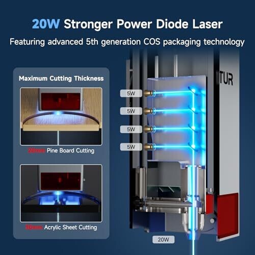 - Experience industry-grade precision with a true 20W laser designed for fast, clean engraving and cutting across wood, leather, acrylic, and more.