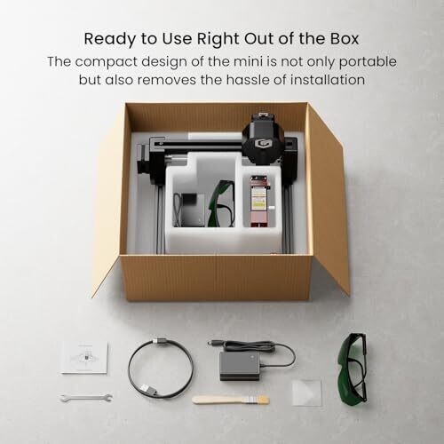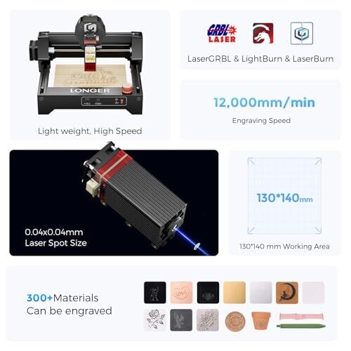 High-Speed 2.5W Laser Engraving – Powered by a 32-bit motherboard with speeds up to 12000mm/min, 20% faster than similar models, ensuring smoother, more precise engraving and cutting. Ultra-Fine 0.04mm Compressed Spot – Advanced compression technology delivers detailed, high-contrast results on wood, acrylic, coated metal, leather, and more. WiFi & APP Control – Compatible with LaserGRBL and LightBurn software; built-in WiFi enables mobile APP operation for convenient, real-time control without being tied to a computer. One-Piece Pre-Assembled Design – Ships fully assembled, ready to use out of the box; dovetail fixed-focus laser head allows quick height adjustment for various material thicknesses. Enhanced Safety & Offline Engraving – Equipped with Emergency Stop, Eye Protection; supports offline engraving for flexible, cable-free projects anytime, anywhere. Compact & Lightweight Design – Measuring only 292×286×165mm and weighing 1.47kg, this mini laser engraver is easy to place on any desktop or carry for creative work anywhere. Wide Material Compatibility – Perfect for engraving on wood, acrylic, leather, coated metal, paper, fabric, and more, making it ideal for DIY projects, personalized gifts, and professional crafts.