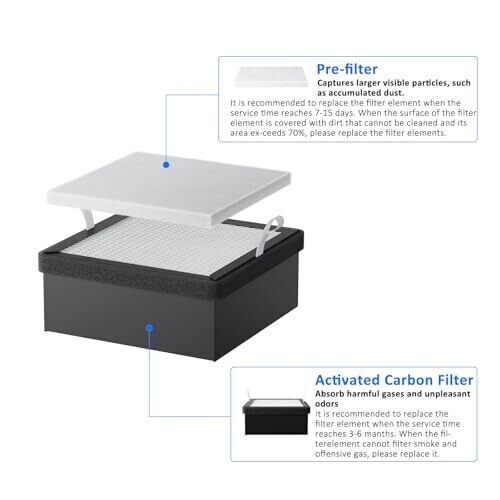 - 2-in-1 filtration system combining a durable pre-filter with an activated carbon filter for improved air quality.