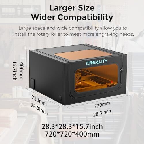 - Generous interior space (720 x 720 x 400 mm) to accommodate larger engravers and optional rotary rollers.