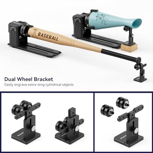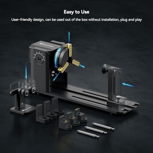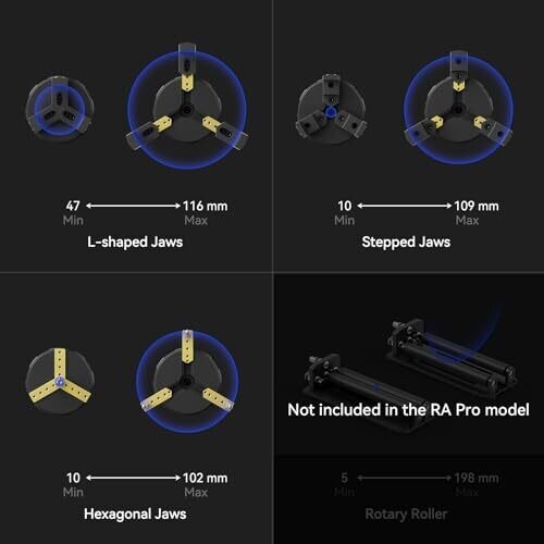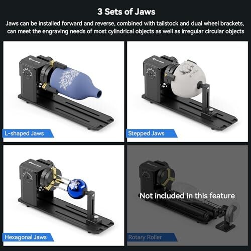 Expands engraving on cylindrical and irregular objects with a versatile rotary solution. Three claw styles—trapezoidal, L-shaped, hexagonal—provide adaptable gripping. Angle up to 180°, plug-and-play with adapters. Durable metal build; compatible with LightBurn, LaserGRBL, and S-series machines.