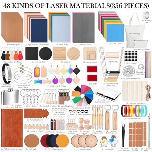 Tondiamo 356 pcs Laser Engraving Material Kit, DIY Laser Engraver Accessories with Acrylic, Glass, Wood, Stainless Steel