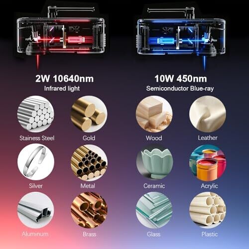 • Dual-laser versatility for engraving on metal, wood, glass, and leather