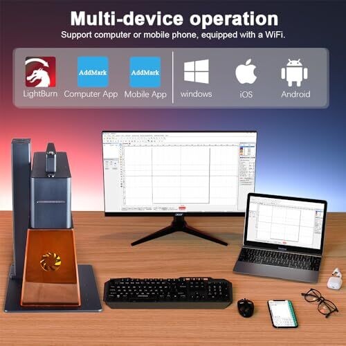 Dual-laser versatility for engraving on metal, wood, glass, and leather. Rotary holder enables curved shapes such as bottles. Portable desktop design for quick in-store customization, high-speed production, wireless control, and broad device compatibility.