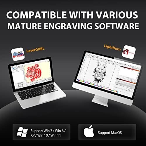 32-bit motherboard; compatibility with common software including LaserGRBL and LightBurn; supports Windows, macOS, and Linux ecosystems.
