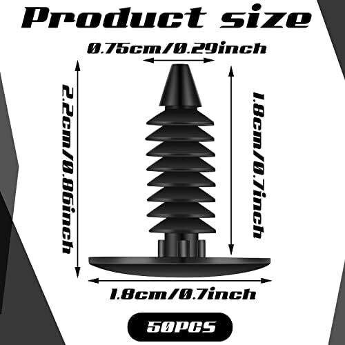 The product package contains 50 honeycomb laser bed pins in black color. The pins are made from quality plastic material and are designed to be durable, resistant to breaking, rust, and deformation for long-term use. They feature a thread design that attaches securely to the honeycomb bed and resists loosening or damage, with a thickness of 1 mm for malleability. The pins are intended for fixing soft materials on the honeycomb bed and can help reduce testing or confusion during cutting or engraving. Each pin is sized for compatibility with honeycomb grids measuring approximately 7.5–8 mm (0.3–0.31 inches) on the small head, and users should verify the size before ordering to ensure proper fit.