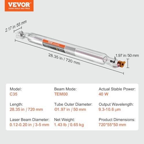 Vevor Laser Tube, 40W CO2 Tube for Engraver and Cutter, 720mm TEM00 Beam