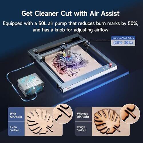 - Air-assisted performance: built-in air tube and pump optimize cutting quality, reduce burn marks, and deliver crisper edges.