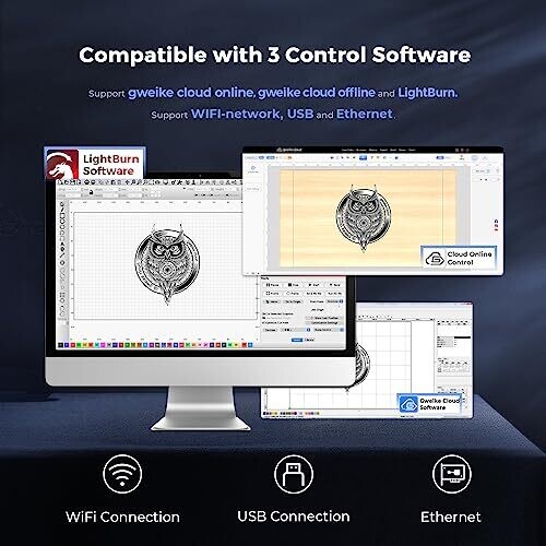 compatible with LightBurn, CorelDRAW, Photoshop, AutoCAD; design upload via Wi‑Fi, USB, and Ethernet.