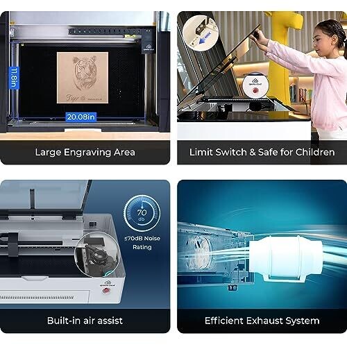 high-performance exhaust system with external duct fan; built-in air assist to improve engraving/cutting efficiency and reduce noise.